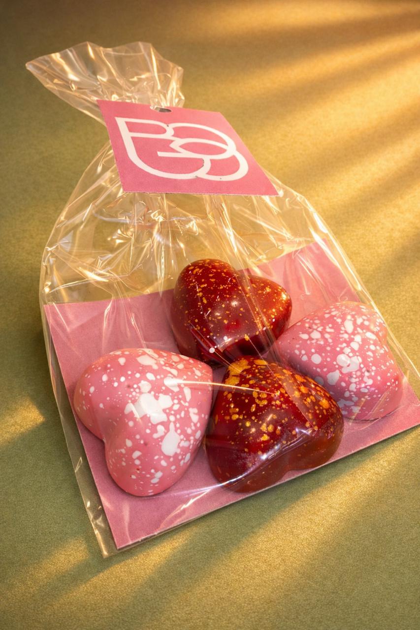 Mix de 2 bombones de chocolate blanco rellenos de frambuesa y 2 bombones de chocolate blanco con ganache de gin. Incluye tarjeta para regalo. Edición Especial del Dia del Amor